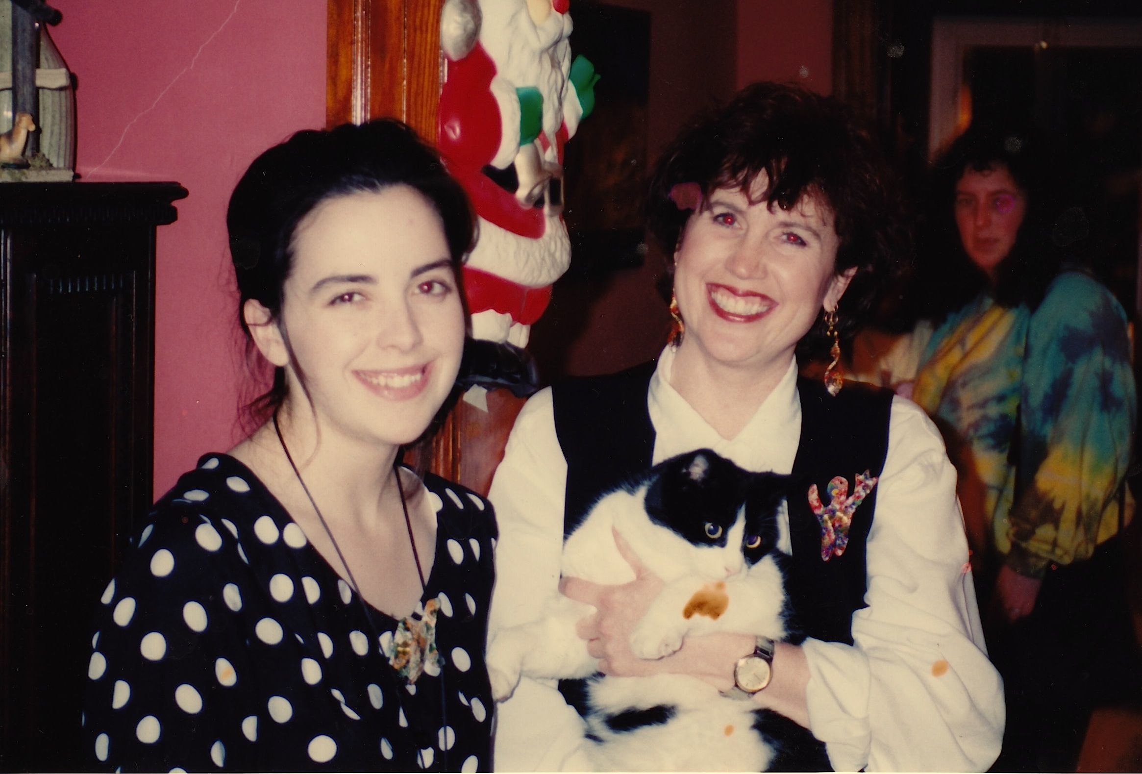 Lisa, her cat, and me in 1993 or 94, at one of her soirées. We are both wearing examples of her designs. Photographer unknown – apologies! (We are both wearing black and white so her colourful work would stand out.)