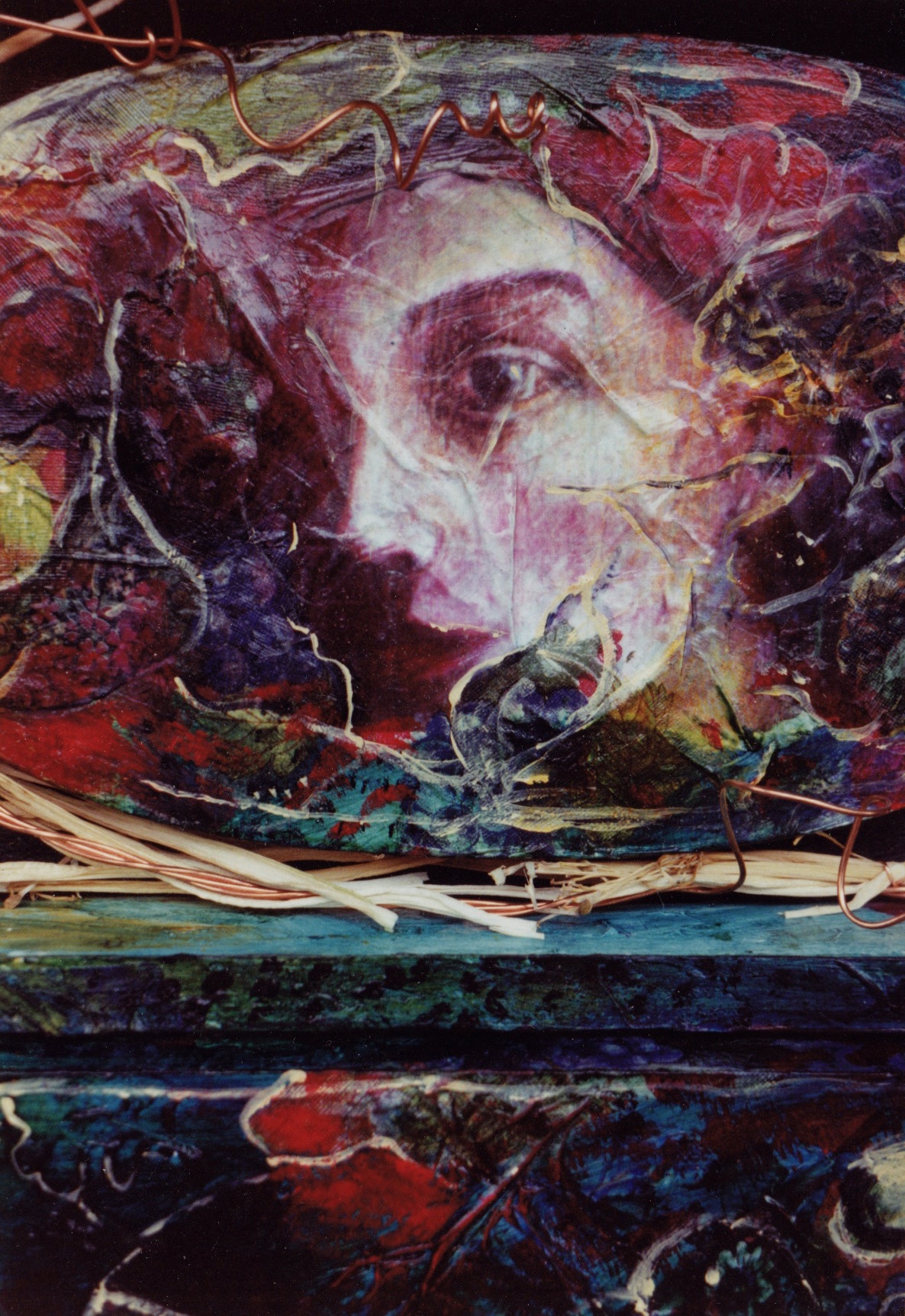A detail of another work using a photocopy of the self-portrait in the previous image. This photocopy was combined, with other media such as fabric, copper wire, and acrylic paint, to a wooden structure, approximately 1.5 x 1 x .5′
