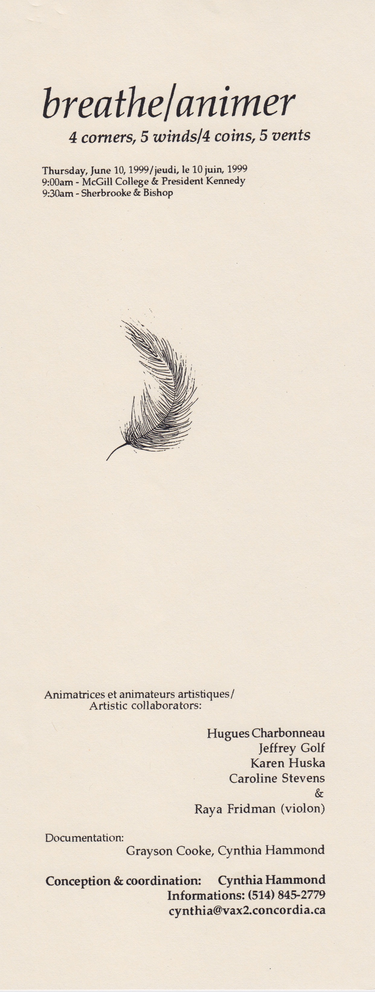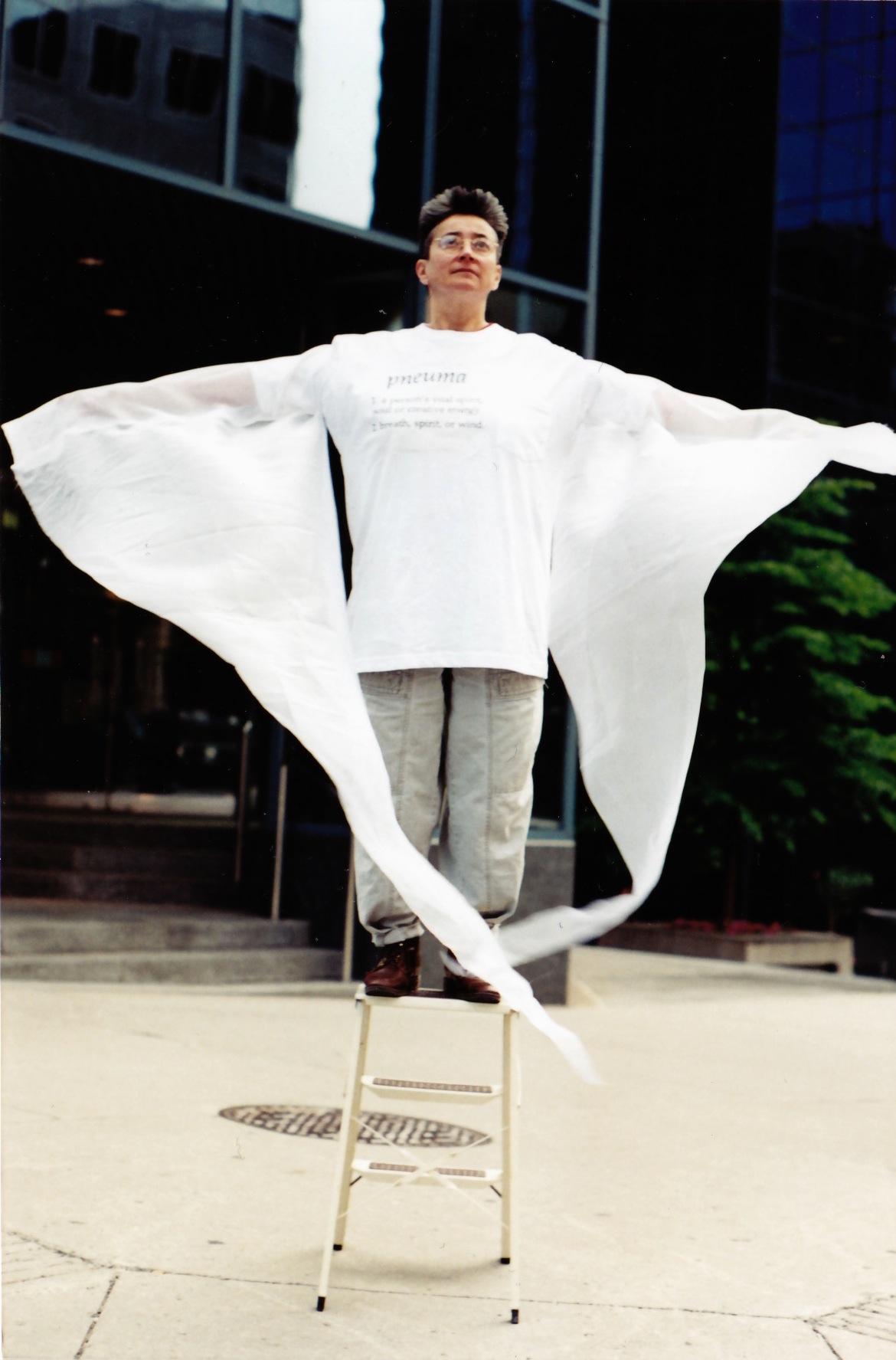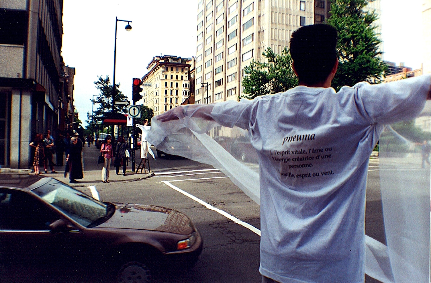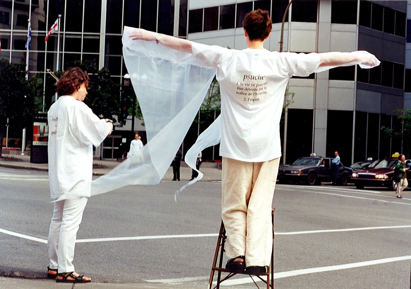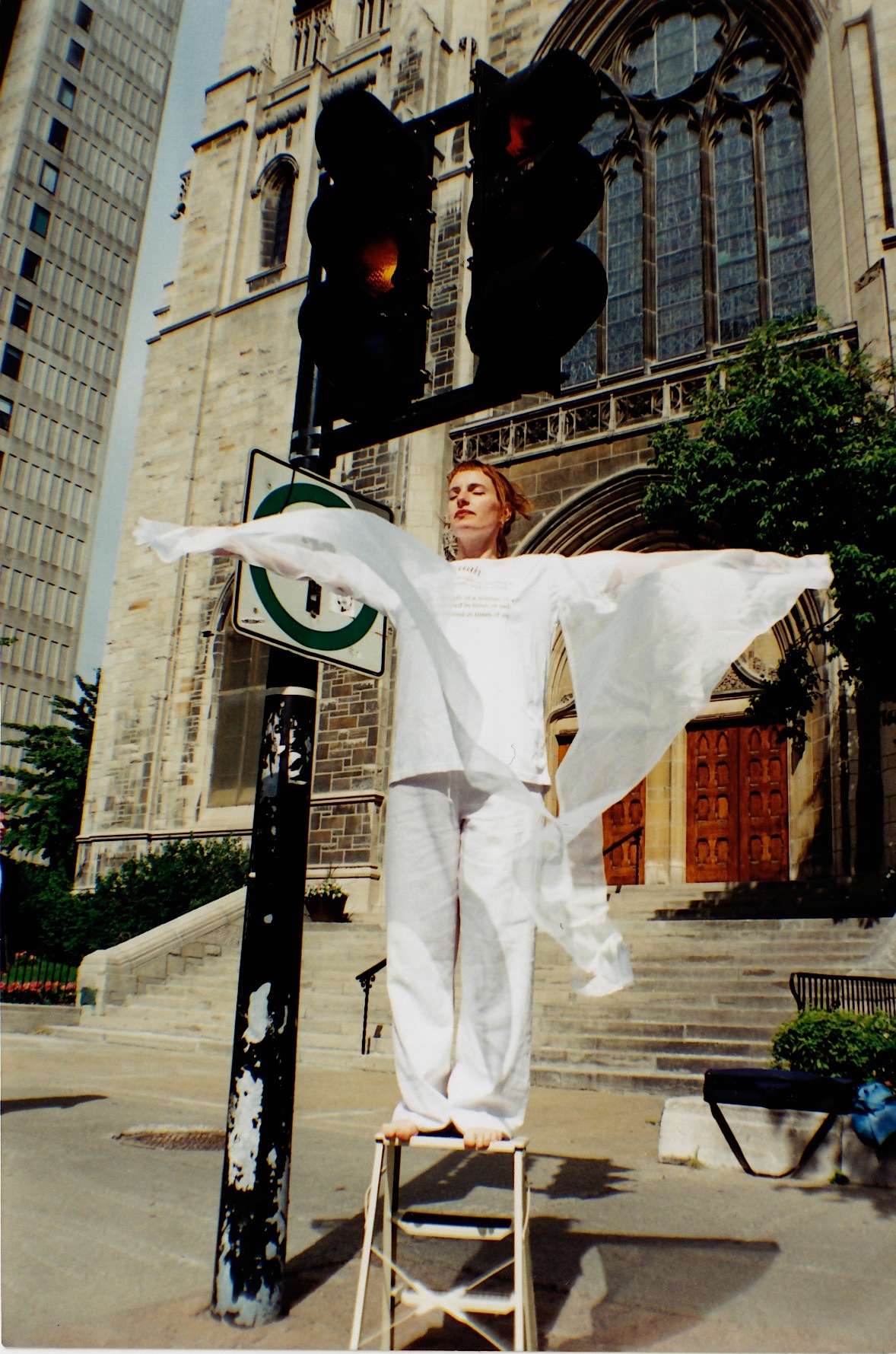 In the late 1990s and early 2000s I began to work more seriously with performance as a mode of engaging with publics, and spaces. Through my studies with feminist professors such as Janice Helland, Joan Acland, and Catherine MacKenzie (all then working at Concordia University’s Department of Art History), I had begun to see that taking up space was an inherently political gesture, and how that gesture – placing oneself in space – had multiple potentials in terms of feminist art practice. At this time, I was still exploring the image and signification of the winged human figure, and my research into this world had, through my studies with Rosemary Drage Hale, led me to explore the concept of the soul. These various investigations resolved in a performance I created in the summer of 1999, titled breathe/animer.