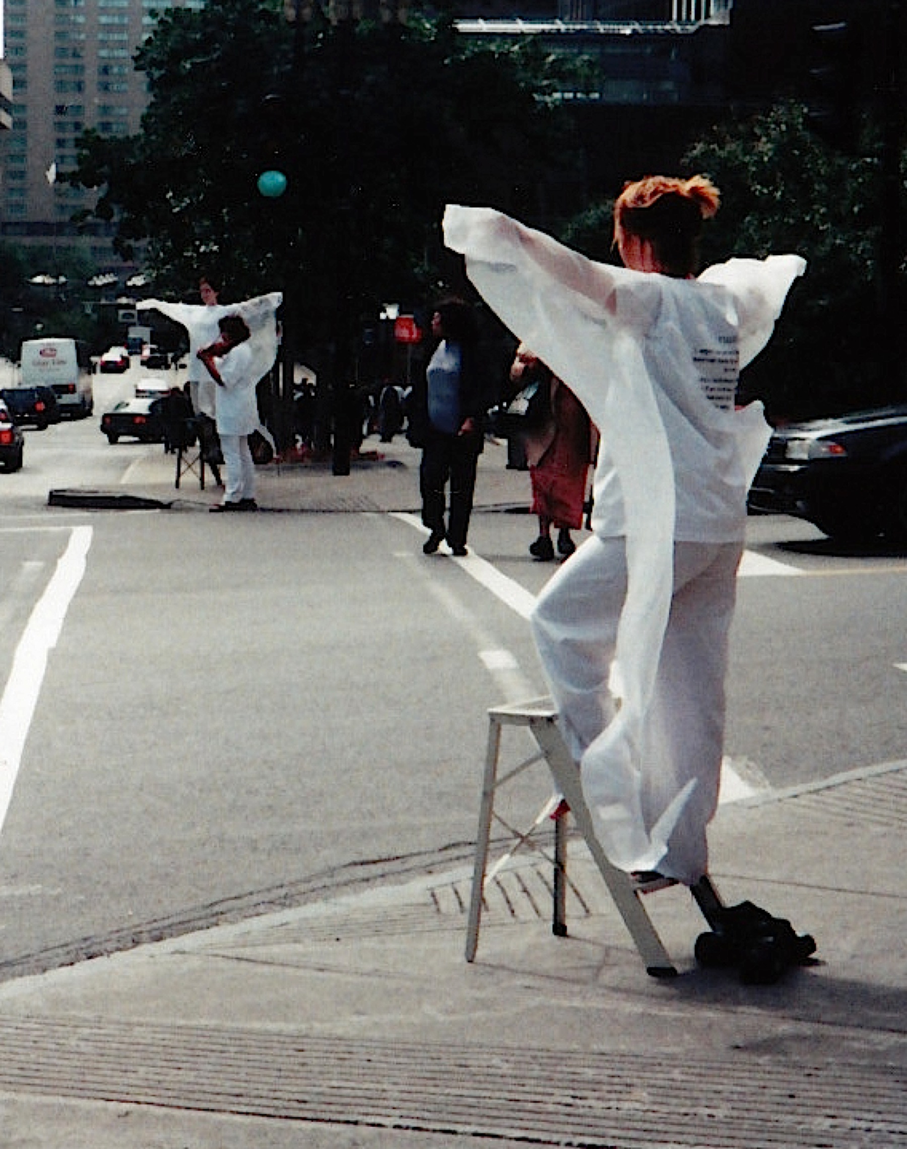 In early June, four performers and I occupied two different street corners of Montreal during morning rush hour. The performers, dressed in white and wearing wing-like sleeves, each took their place at one of the four corners of the intersection and stood motionless next to a low ladder. Then, violinist Rhaya Fridman played an improvised composition as she walked slowly from one corner to the next, making a complete circle. As she passed, each performer climbed their ladder and raised their arms. Each of us had an ancient word, and its definition, printed in English and French on our clothing. These words related the importance of breath, air, and wind to life: ruah, nefesh, psuche, pneuma. When Rhaya completed her circle, the performers lowered their wings/arms, and slowly descended their ladders. Rhaya finished playing, and the performance ended.