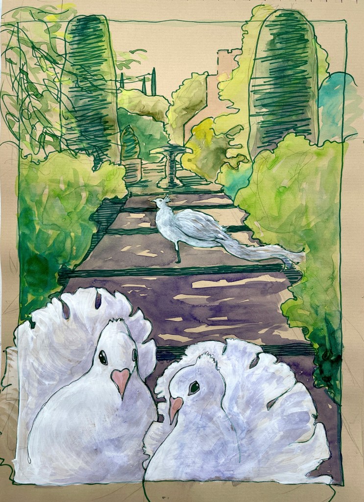 La Napoule was an idyllic environment in which to explore my longstanding interest in women and gardens. The gardens remain very much as Marie Clews designed them: vibrant evergreen plantings in axial arrangements that hid an array of “secret” gardens with windows to the sea, water features, sculpture, and a “philosopher’s walk”. Then, as today, the deep green cypress, cheese wood, and thyme bushes were animated by starry white blooms (Marie Clews only permitted white flowers in her plantings). My work drew from the design richness of the garden, as well as hundreds of historic photographs found in the Foundation’s archive. What I learned from these photographs was that, during the garden’s golden era, 1919-1937, the family kept an all-white menagerie in the garden. In addition to the family’s beloved white bulldogs, Tory and Snob, the garden was home to a range of exotic birds. Often, they chose the rare, white version of these birds; white peacocks and white flamingos joined white swans, fantail doves, and egrets.