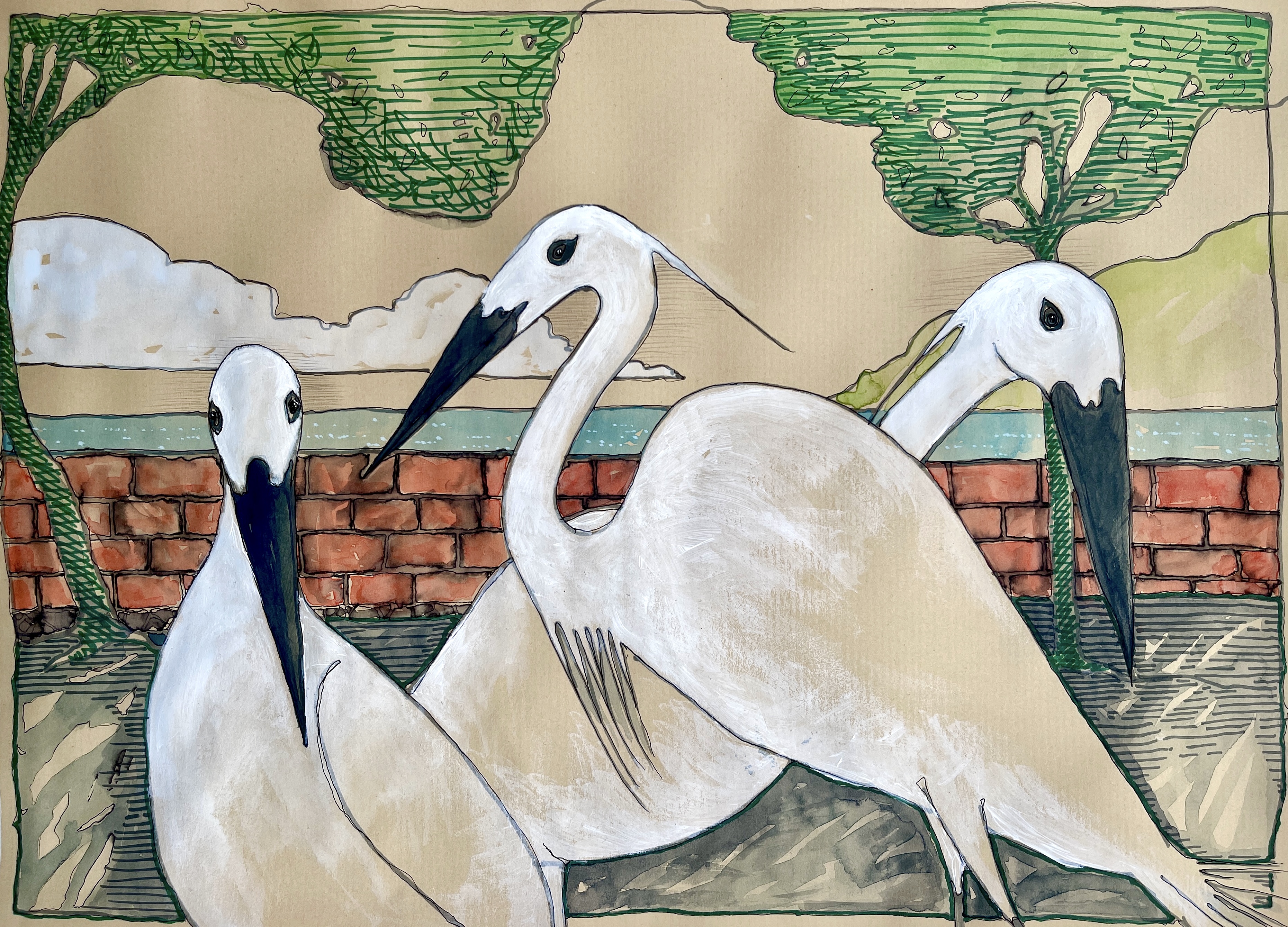 The three major works that I produced were all in-progress at the time of the open studio. They are large-format paintings (4.5 x 8′), on unstretched linen. The neutral tone of the linen helps neutralize the flatness and brightness of acrylic paint, while creating a figure-ground relationship that evokes drawing rather than painting. Yet the absorbency of the linen results in effects that are reminiscent of watercolours. I worked with small sketches to develop the compositions, gridding them up in a 1:10 scale to establish proportions, and then gridding them up again 1:10 on the linen once I was happy with the preparatory drawings.