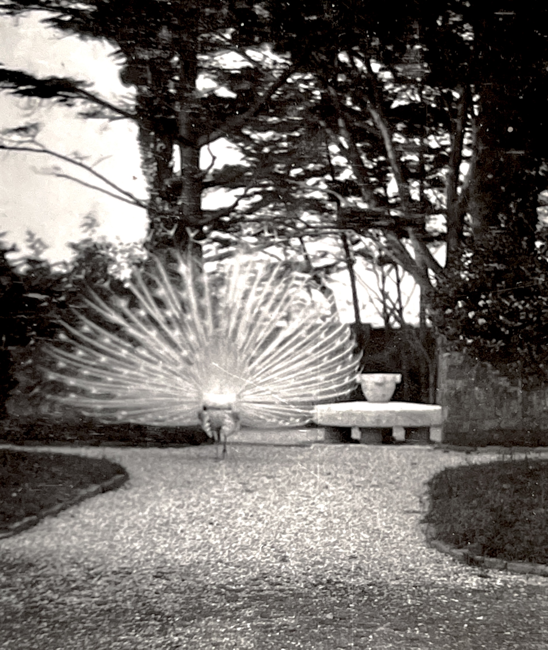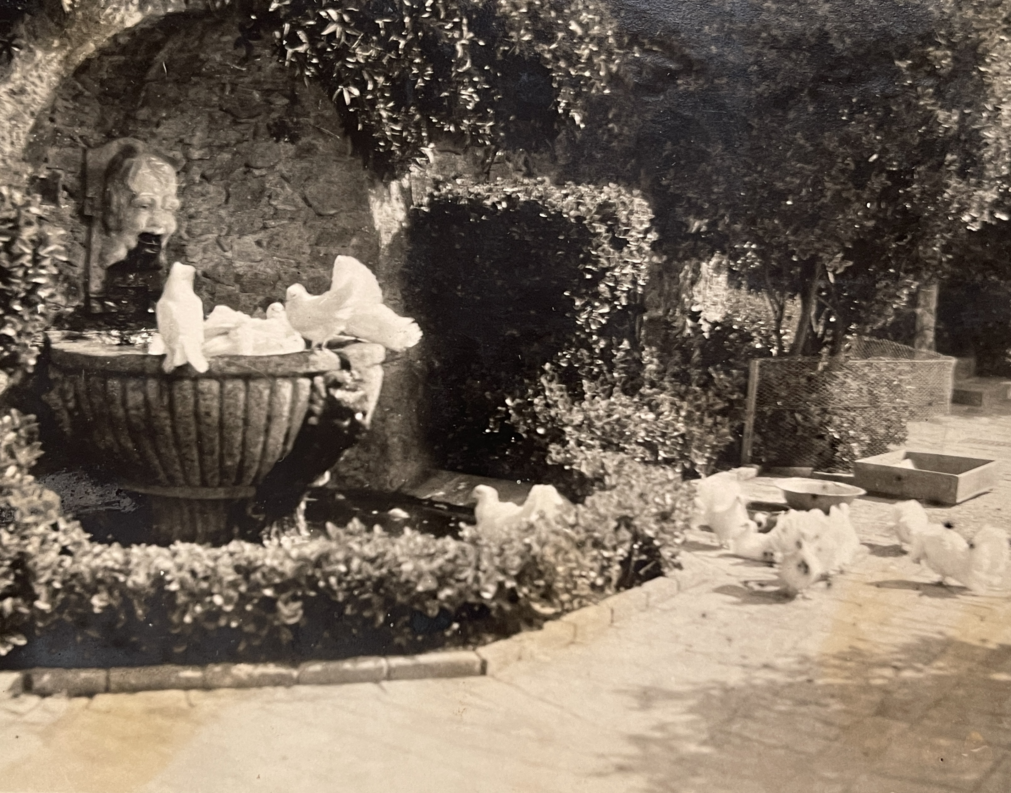 How magical it would have been to enter Marie Clews’ gardens to find the dark foliage contrasting with the white petals and feathers of various birds. What a dream-like encounter to turn a corner in the garden, and find a white peacock resting on one of the many stone garden elements, or see the white flamingos bathing in the pond. Yet the photographs are also evidence that, like other menageries, the Clews’ garden was not a place that the birds were free to leave.