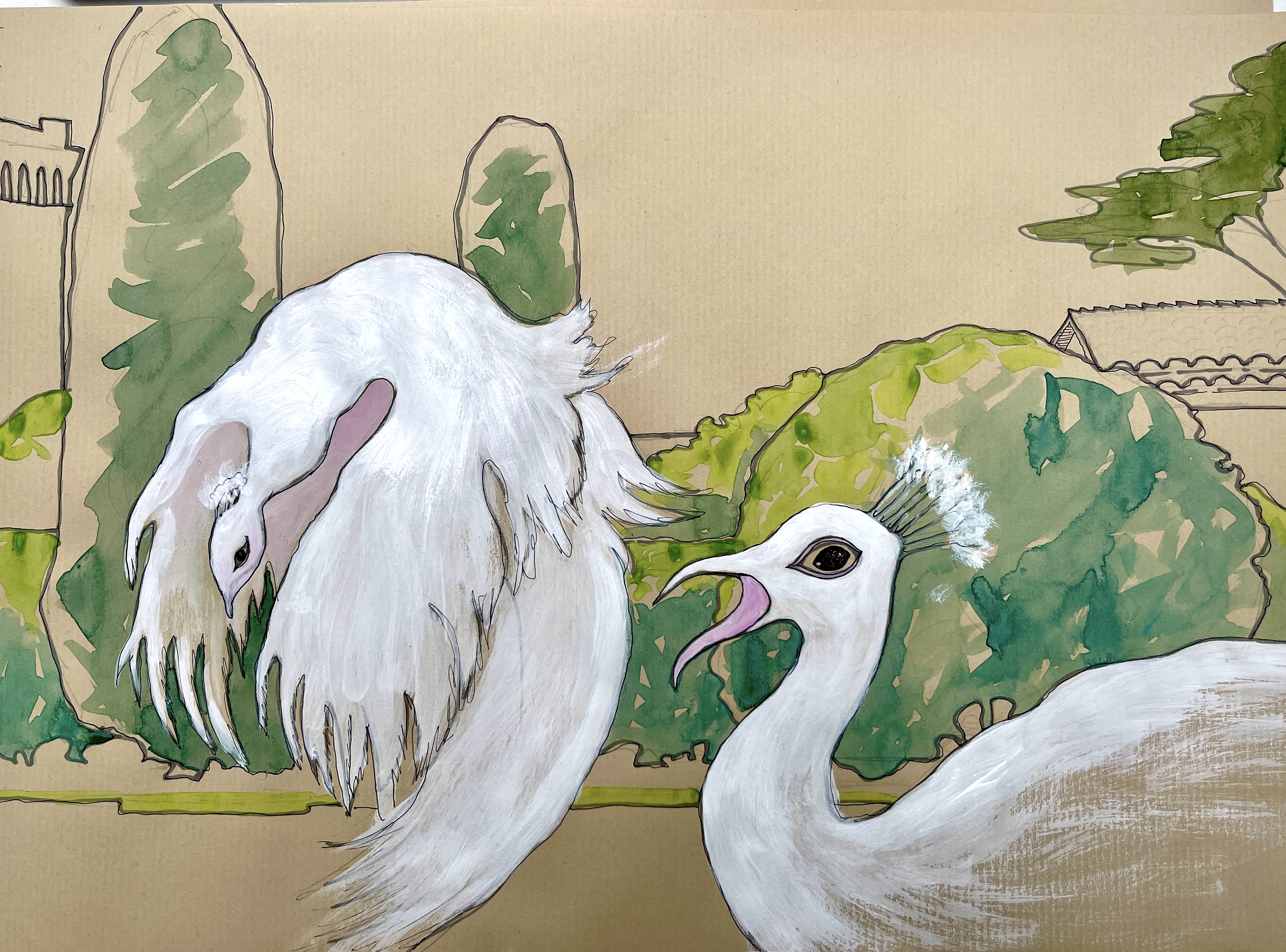 La Napoule was an idyllic environment in which to explore my longstanding interest in women and gardens. The gardens remain very much as Marie Clews designed them: vibrant evergreen plantings in axial arrangements that hid an array of “secret” gardens with windows to the sea, water features, sculpture, and a “philosopher’s walk”. Then, as today, the deep green cypress, cheese wood, and thyme bushes were animated by starry white blooms (Marie Clews only permitted white flowers in her plantings). My work drew from the design richness of the garden, as well as hundreds of historic photographs found in the Foundation’s archive. What I learned from these photographs was that, during the garden’s golden era, 1919-1937, the family kept an all-white menagerie in the garden. In addition to the family’s beloved white bulldogs, Tory and Snob, the garden was home to a range of exotic birds. Often, they chose the rare, white version of these birds; white peacocks and white flamingos joined white swans, fantail doves, and egrets.